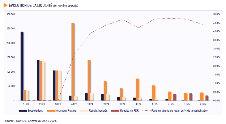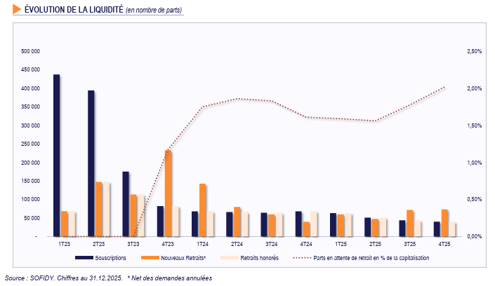 Sur l'exercice 2025, le volume de parts en attente de retrait diminue progressivement sur plusieurs SCPI, notamment IMMORENTE et EFIMMO 1. Les retraits honorés, y compris via des mécanismes dédiés, contribuent à limiter la proportion des parts en attente rapportée à la capitalisation.
