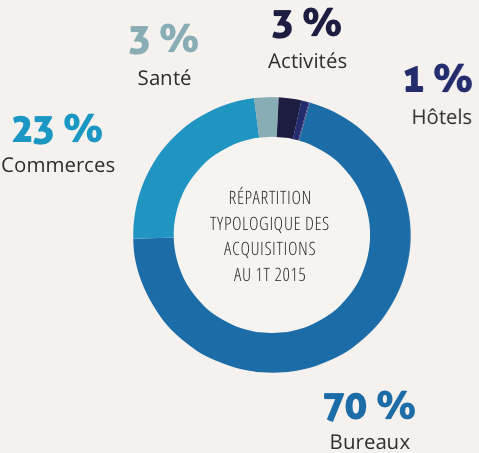Les SCPI ont réparti leurs capitaux dans des actifs diversifiés. Si les bureaux demeurent les actifs privilégiés, la place des commerces dans les acquisitions a augmenté (ils représentent 23 % des acquisitions contre 12,29 % au 4T 2014).