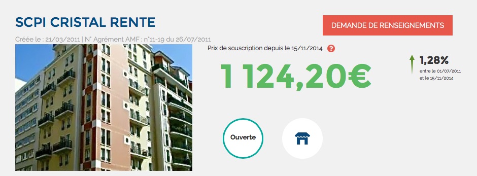 Par ailleurs, le délai de jouissance sera également modifié à compter du 1er juillet 2016. Il sera porté au premier jour du 6ème mois suivant le mois de souscription. Cette mesure vise à assurer la pérennité de la qualité du patrimoine de la SCPI Cristal Rente et la régularité du rendement (5,27% pour rappel en 2015).