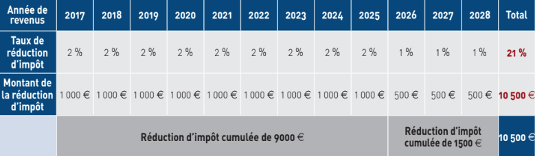 Urban Vitalim N°2 est une SCPI fiscale spĂ©cialisĂ©e dans le dispositif Pinel. En terme de fiscalitĂ©, la rĂ©duction dâimpĂŽt sera de 21 %* du montant total de la souscription. Pour bĂ©nĂ©ficier de ces rĂ©ductions fiscales, lâassociĂ© devra conserver ses parts pendant une pĂ©riode de 12 ans Ă compter de la premiĂšre mise en location du dernier immeuble acquis ou rĂ©novĂ©. La rĂ©duction dâimpĂŽt sera effective au cours des 9 premiĂšres annĂ©es Ă hauteur de 2 % par an puis 1 % sur les trois derniĂšres annĂ©es, soit un total de 21 %.Â
