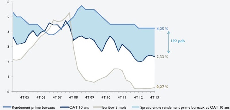 Fin 2013, le loyer moyen prime francilien annuel s’établissait à 753 €/m², en baisse de 10 % par rapport à 2012. Malgré cela, les taux de rendement demeurent stables. Le loyer moyen pourrait toutefois, cette année, être en progression avec la commercialisation d’opérations emblématiques (1, Euler et 3-5 Friedland), toutes deux situées, à Paris, dans le quartier de l’Etoile.