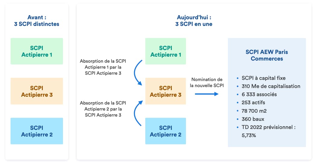Juridiquement, la SCPI Actipierre 3 est la société absorbante et prendra la dénomination "AEW PARIS COMMERCES" avec un effet rétroactif comptable et fiscal au 1er janvier 2022. Par ailleurs, le marché secondaire organisé des 3 SCPI a été suspendu le 31 mars 2022, dans le cadre de la fusion, et tous les ordres d’achat et de vente de parts ont été annulés. Il est à nouveau ouvert depuis le 11 juillet, selon les mêmes modalités et fréquence mensuelle.