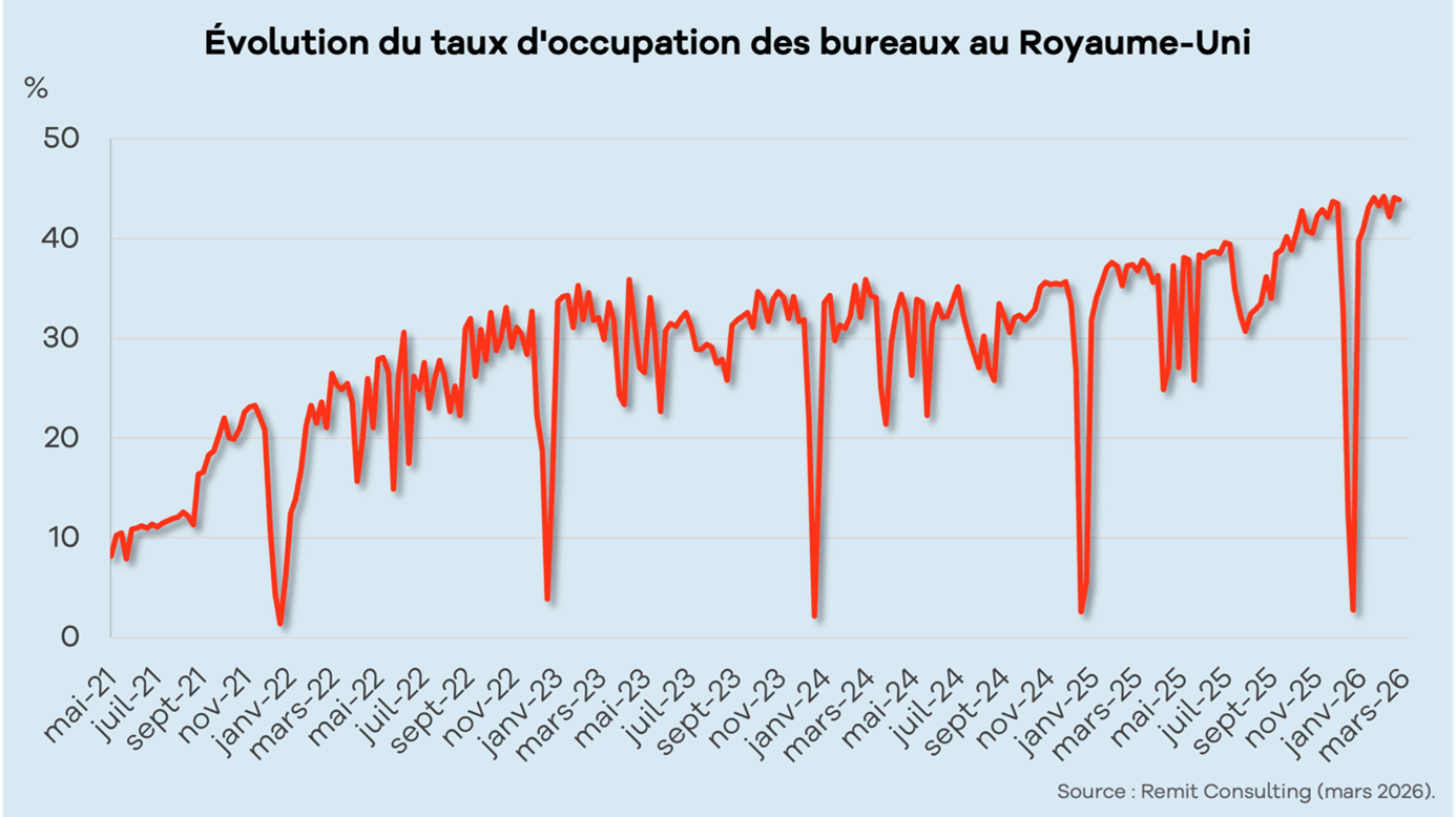 - UK office occupancy stabilises above 40% as sector divide widens”, Remit Consulting, février 2026