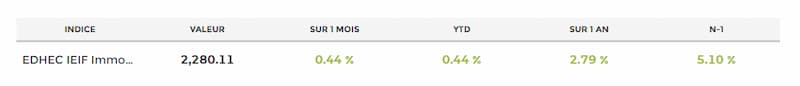 GrĂące Ă lâindice de prix EDHEC IEIF publiĂ© mensuellement, le taux de rendement moyen des parts Ă©changĂ©es par un portefeuille de placement immobilier non cotĂ© peut ĂȘtre chiffrĂ©. Ă noter que lâindice EDHEC IEIF regroupe les fonds de placement immobilier ayant enregistrĂ© plus de 2 M⏠de transactions sur le marchĂ© secondaire, au cours de lâannĂ©e prĂ©cĂ©dente.