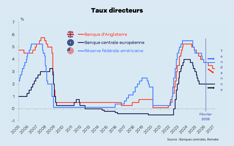 - La Banque d'Angleterre a déjà abaissé son taux directeur de 150 points de base et devrait poursuivre un cycle de détente graduelle, malgré un environnement géopolitique tendu.