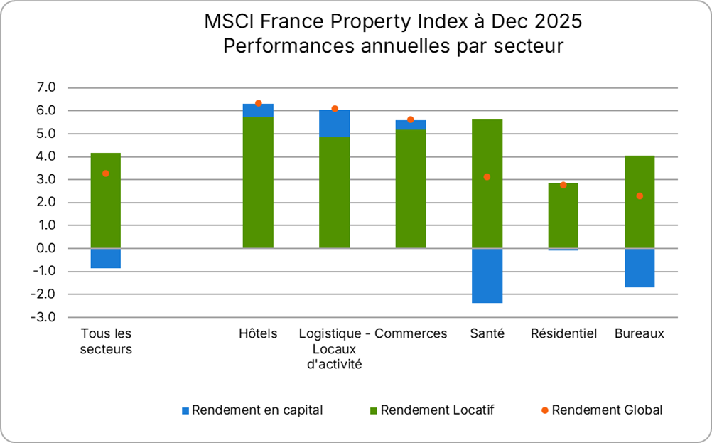 - L'indice MSCI France Annual Property affiche un rendement global de 3,3% en 2025, en dessous de la moyenne décennale de 3,9%, mais confirme la phase de stabilisation.