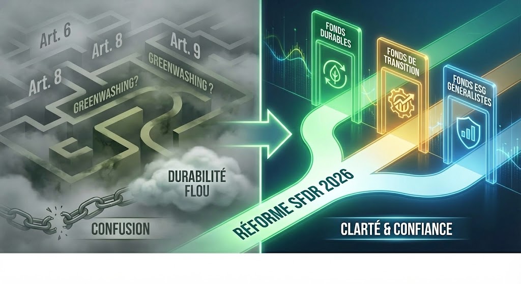 - La réforme du SFDR en 2026 remplace les articles 6, 8 et 9 par trois catégories de fonds : durables, transition et ESG généralistes.