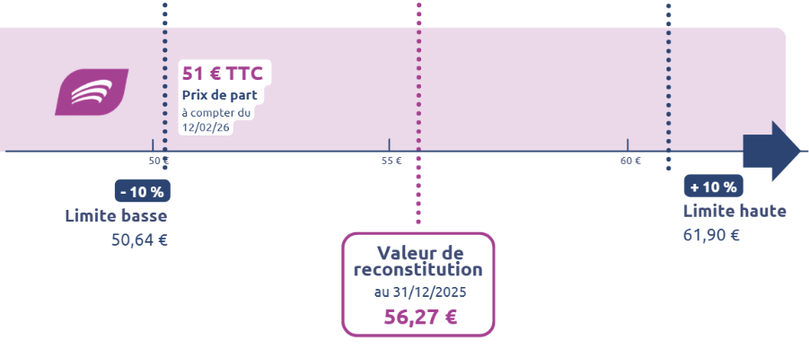 La valeur de reconstitution au 31 décembre 2025 s'établit à 56,27 €. Conformément aux règles des SCPI, le prix de souscription doit rester dans une fourchette de ±10 % autour de cette valeur :
