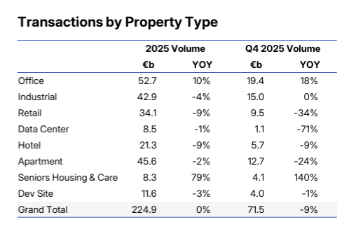 L'année 2025 n'a pas marqué le rebond espéré pour les marchés immobiliers européens. Selon le rapport Europe Capital Trends 2025 publié par MSCI, le volume total d'investissement en immobilier commercial en Europe s'est établi à 224,9 milliards d'euros, un niveau strictement équivalent à celui de 2024, traduisant une situation de stagnation globale du marché. Le quatrième trimestre s'est révélé particulièrement faible, avec 71,5 milliards d'euros investis, en repli de 9 % sur un an.