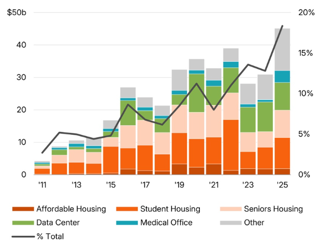 En 2025, les actifs dits alternatifs – en dehors des bureaux, commerces et industriels traditionnels – ont représenté 18 % du volume total des transactions européennes, un niveau record. Ces segments incluent notamment :