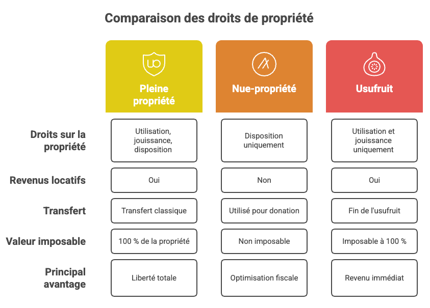 La distinction entre pleine propriété, nue-propriété et usufruit est essentielle pour structurer une stratégie patrimoniale adaptée.