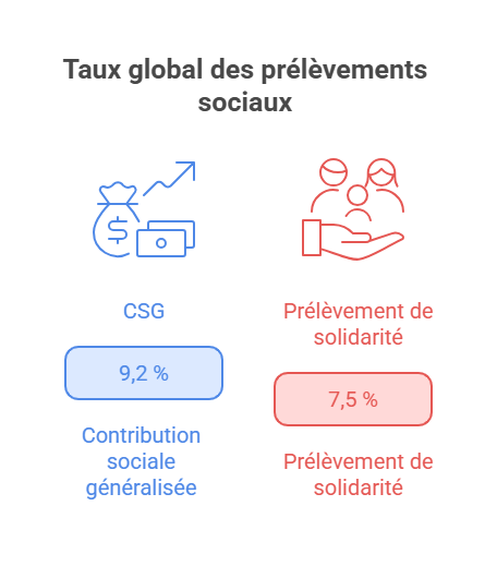 Les prélèvements sociaux regroupent principalement la CSG (9,2 %), la CRDS (0,5 %), et des contributions additionnelles (dont le prélèvement de solidarité de 7,5 %). Ensemble, ils représentent un taux global de 17,2 % sur les revenus du patrimoine et les produits de placement. Ces contributions servent notamment à financer la sécurité sociale et à rembourser la dette sociale.